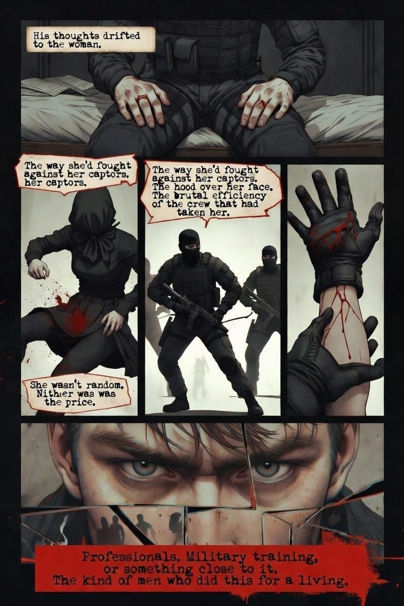 His thoughts drifted to the woman. The way she’d fought against her captors. The hood over her face. The brutal efficiency of the crew that had taken her. Professionals. Military training, or something close to it. The kind of men who did this for a living.