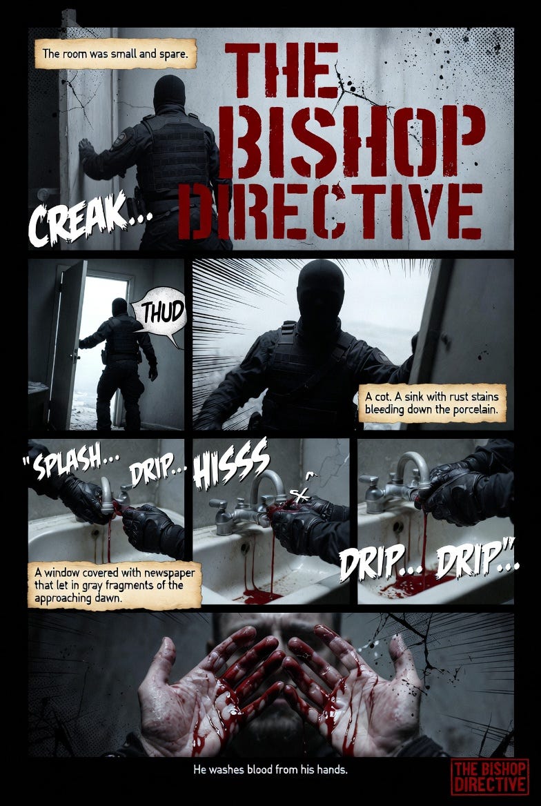Bishop found a safe house. One of three he maintained in the city. A single room above a mechanic’s shop, paid six months in advance in cash to a landlord who’d never asked his name. The stairs groaned as he climbed them. The lock took three tries with his shaking hands.