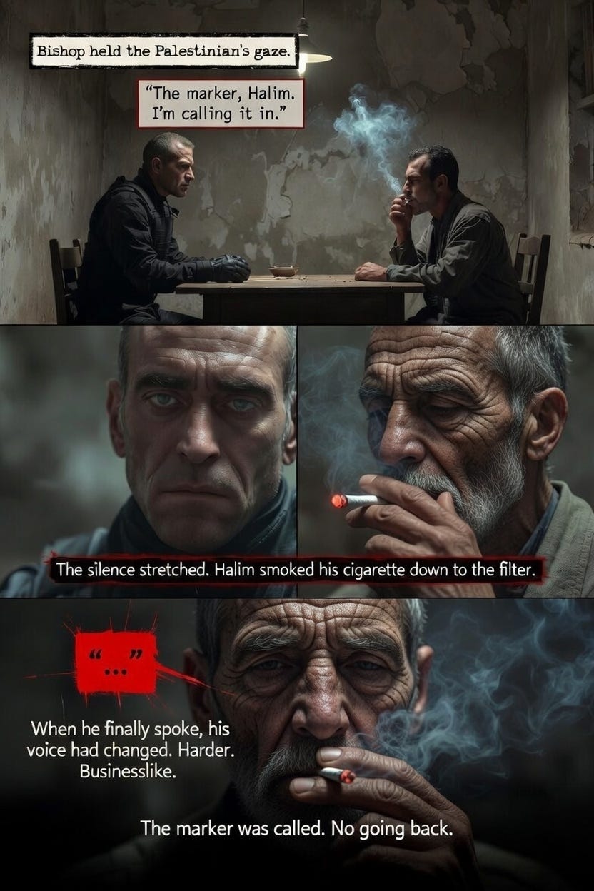 Silence. Halim’s expression didn’t change, but something shifted behind his eyes. The marker. The debt. The life Bishop had saved when everyone else had written the old Palestinian off.