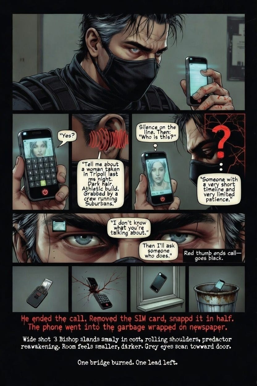 At 0630, Bishop rose from the cot and checked the window. The street below was filling with morning traffic. Scooters. Delivery trucks. Nothing that screamed surveillance. Nothing that felt wrong.